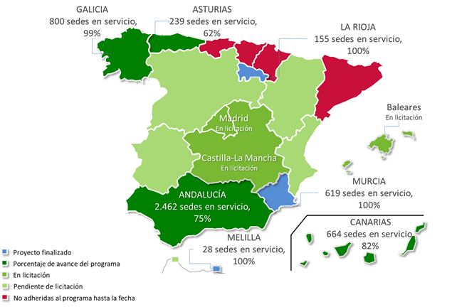 La siguiente figura (fig.1) muestra el estado de implantación de los distintos proyectos de conectividad que están siendo ejecutados por Red.es: