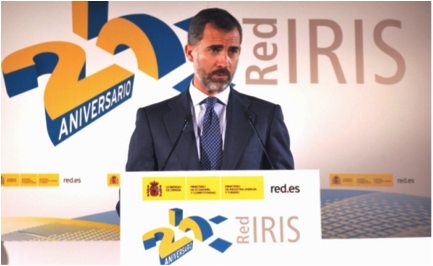 El pasado 29 de octubre, el Ministerio de Industria, Energía y Turismo acogió el acto conmemorativo del 25 Aniversario de RedIRIS. El encuentro estuvo presidido por su Alteza Real el Príncipe de Asturias, Don Felipe de Borbón y Grecia; que destacó en su discurso la importante labor de RedIRIS y su utilidad para los investigadores españoles poniendo a su disposición el uso de los instrumentos más sofisticados en un entorno de colaboración global. Además, señaló que esta infraestructura también ha demostrado ser una herramienta eficaz para fomentar la cohesión territorial, facilitando en toda España la conectividad y los servicios necesarios para avanzar en la carrera científica y tecnológica.