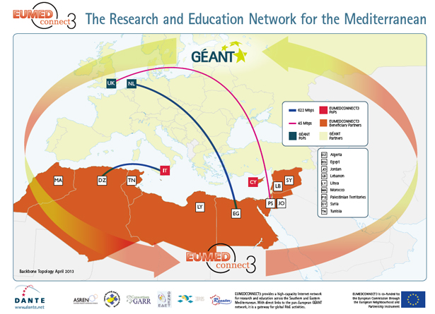 RedIRIS, junto con algunas otras redes académicas y de investigación (National Research and Education Networks, “NRENs”) europeas, lleva desde el año 2004 participando en una serie de programas europeos (EUMEDCONNECT 1, 2 y 3) para fomentar el desarrollo de redes académicas en los países de la cuenca del Mediterráneo.