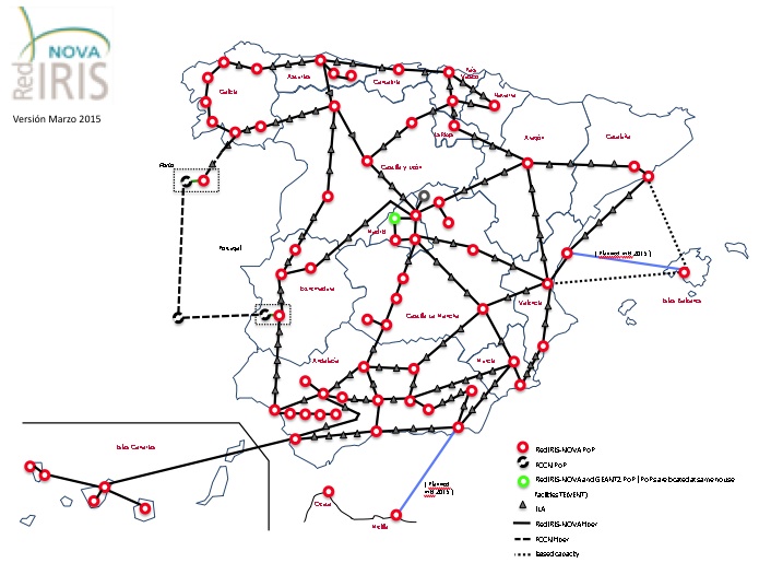 Sin embargo, su conexión con fibra oscura a RedIRIS-NOVA es una realidad cuyo despliegue comienza a ejecutarse en marzo 2015. La licitación lanzada a finales del 2014 y adjudicada este mes de febrero, va a permitir completar una huella de fibra oscura que cubra todo el territorio nacional (con la excepción, de momento, de Ceuta y Melilla).
