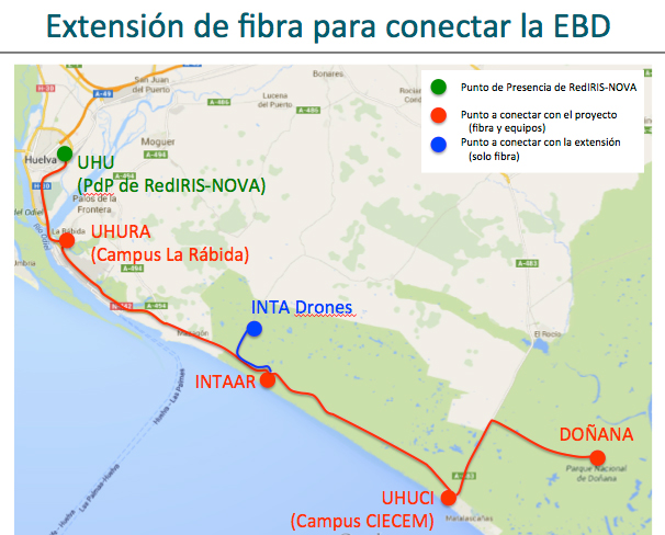 En 2015 se han llevado a cabo varios de esos despliegues adicionales. En particular, se ha completado la puesta en marcha de la fibra para conectar las Islas Baleares que se anunció en la edición número 4 del e-Boletín. También se ha conectado Melilla a RedIRIS-NOVA, iluminando un enlace de fibra submarina entre Melilla y la península, en concreto, la fibra submarina entra hasta Roquetas de Mar, desde donde se ha realizado una extensión de fibra terrestre hasta el Punto de Presencia de RedIRIS en la Univerdidad de Almería, donde se ha instalado el equipamiento óptico. Esta conectividad se completa con la construcción de un nuevo Punto de Presencia de la red IP de RedIRIS en Melilla. Está previsto, también, en 2016 realizar una conexión similar con Ceuta. Otro importante despliegue que se lanzó en 2014 (ver noticia del e-Boletín nº3) y que se ha finalizado en 2015, ha sido la extensión de la red troncal hasta la Estación Biológica del CSIC de Doñana (EBD), desde el punto de presencia de RedIRIS en la Universidad de Huelva (UHU, campus del Carmen). Además, en la trayectoria de esta extensión de fibra se han podido incluir dos centros adicionales de la UHU y el centro del INTA de "El Arenosillo". Pero además, en 2015 se ha puesto en marcha el despliegue de un enlace de fibra adicional para incluir en dicha extensión, y dada su proximidad, el nuevo centro del INTA dedicado a la investigación en vuelos no tripulados. El siguiente esquema muestra la topología completa de esta extensión de fibra. Por último, las extensiones de fibra en Andalucía se completan con la conexión a RedIRIS-NOVA del Parque Científico de Andalucía en Sevilla.