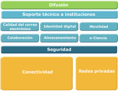 La sección de servicios de RedIRIS cuenta con un gráfico que sirve para acceder a los servicios haciendo clic en las categorías a las que pertenecen: Conectividad, Redes privadas, Seguridad, Calidad del correo electrónico, Identidad digital, Movilidad, Colaboración, Almacenamiento, e-Ciencia, Soporte técnico a instituciones y Difusión.