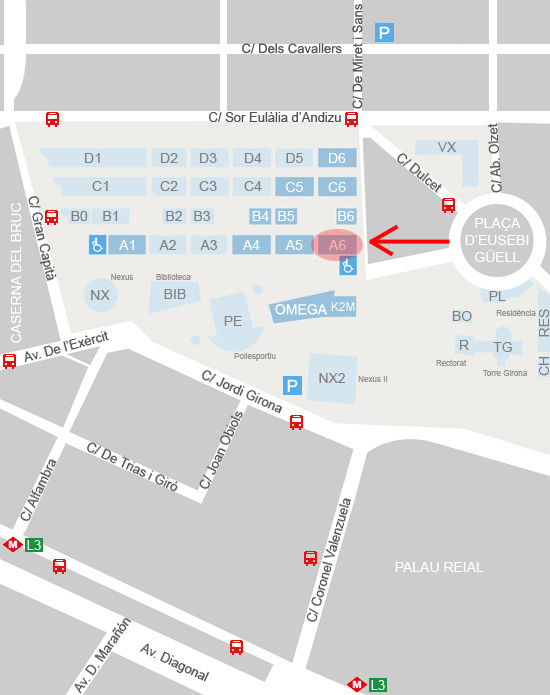 Los Grupos de Trabajo (GGTT) se celebrarán en el Módulo A6 del Campus Nord de la Universitat Politècnica de Catalunya (C/ Jordi Girona Salgado,1-3. Barcelona), que aparece indicado en el plano.