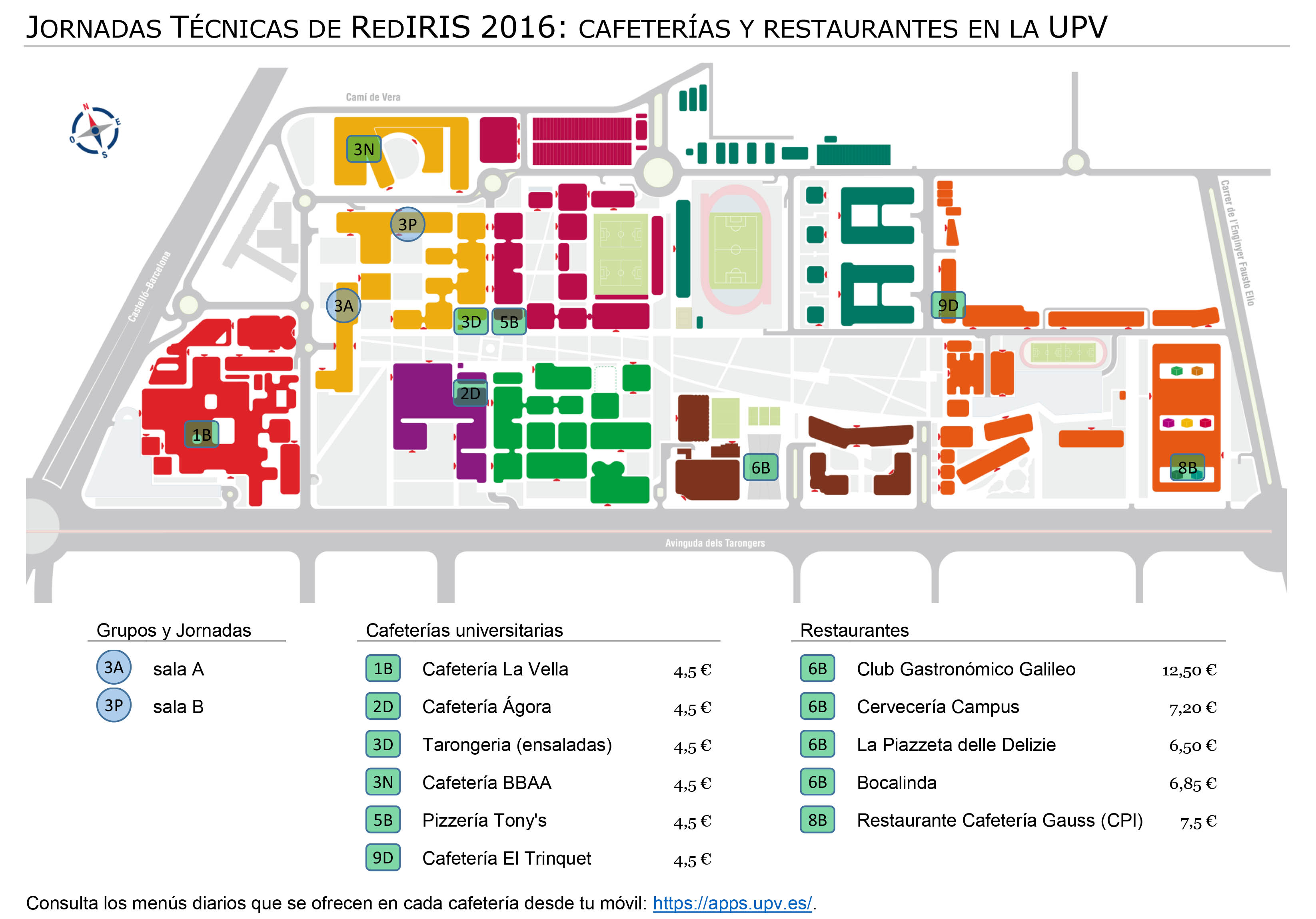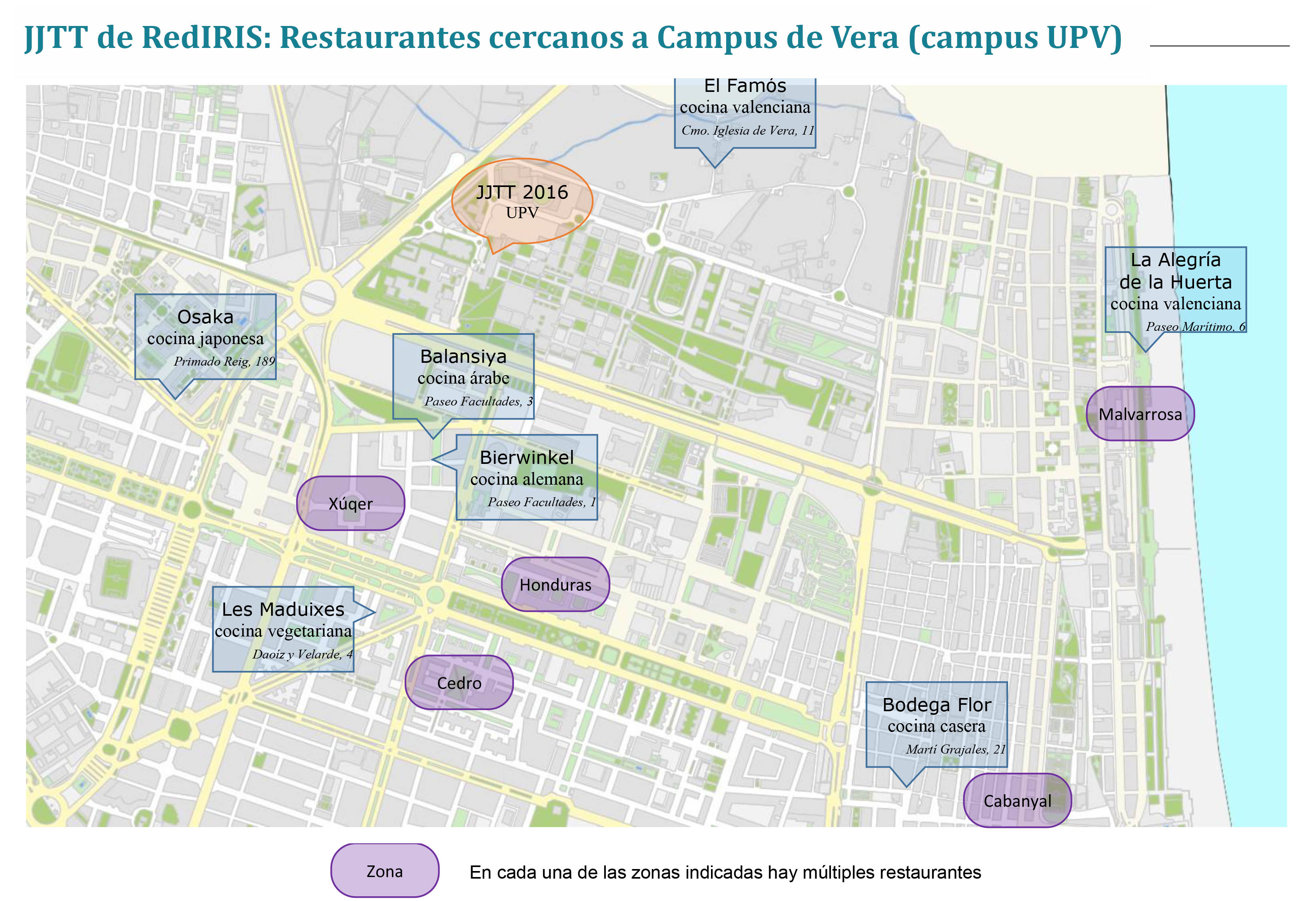 Cerca del lugar de celebración de las Jornadas Técnicas podemos encontrar una amplia variedad de restaurantes. En este mapa podéis ver algunos de los restaurantes que se encuentra a menos de media hora caminando del Campus de Vera y el tipo de comida que ofrecen.