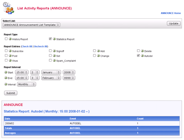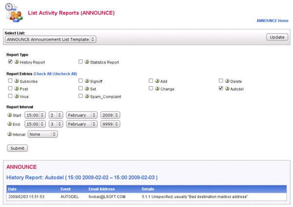 * Change-log= Yes Con esta opción se crean unos ficheros nombrelista.CHANGELOG donde se van almacenando los registros de actividad de una lista. ¿Cómo procesar estos ficheros? la forma mas cómoda es a través de las utilidades web que IRISLIST ofrece a los administradores. En el menú "Área de administradores" seleccione "Informes lista" > "Informes de actividad". Luego seleccione la lista de la que desea conocer la actividad. Hay dos tipos de informes: detallado (histórico) y estadístico. El informe detallado nos muestra la historia completa y detallada en un periodo definido. Por ejemplo podríamos solicitar una informe detallado de todos los suscriptores a los que se les ha dado de baja por problemas técnicos (Auto-Delete) en el mes de Enero y se nos devolvería una linea por cada baja automática junto con la dirección que fue suscrita, la fecha y hora y los motivos.