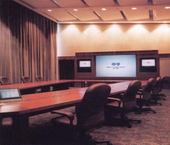 · MOBILIARIO-DECORACION: Con respecto al mobiliario o la decoración hay que tener en cuenta la necesidad de que las personas que intervengan tengan tras de sí un fondo que permita el correcto contraste de la imagen con respecto a dicho fondo. Por ejemplo, una persona que tenga tras de sí una pared totalmente blanca y vestida con ropas claras producirá una señal de vídeo de muy mala calidad, sin contraste alguno, de tal forma que tras la codificación de dicha señal por el equipo de videoconferencia, en especial en transmisiones con poco ancho de banda (por ejemplo RDSI a 64 Kbit/s) será recibida y mostrada en el lugar remoto de forma apenas perceptible. Es por ello que se recomienda que las paredes en torno a la mesa, dispongan de algún tipo de decoración que permita la distinción con respecto al plano del interviniente (mobiliario, cortinas, moqueta, etc.) En cuanto al mobiliario es recomendable huir de aquellos que introduzcan superficies muy pulidas (mesas de cristal, vitrinas, etc.) que producen reflexiones acústicas de considerable energía, por lo que deterioran la calidad de escucha en la sala. Sí resulta muy aconsejable disponer de mobiliario, en particular la mesa, con posibilidad de integrar el cableado técnico necesario, lo que evitará el tendido de cables hacia las paredes o sobre la mesa, con el consiguiente peligro y deterioro estético de la sala.