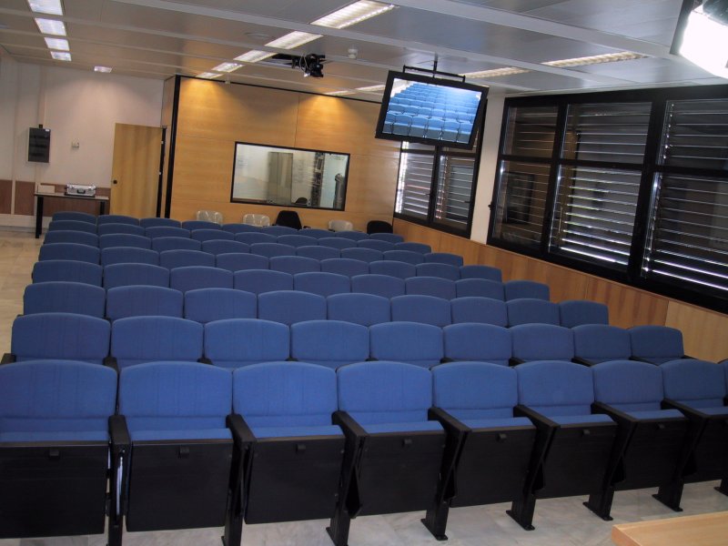 · ACUSTICA: Las condiciones acústicas deberán ser adecuadas para la escucha de la palabra, por lo que se habrá de conseguir valores del tiempo de reverberación bajos (inferiores a 1 segundo a frecuencias medias), por lo que se deberá tratar acústicamente en la mayoría de los casos algunas de las superficies límites, en especial el techo, mediante la colocación de materiales absorbentes a frecuencias medias-altas. La sala también debería presentar un correcto aislamiento acústico respecto al posible ruido procedente de salas anexas o el exterior, siendo aconsejable la ubicación de este tipo de salas en entornos poco ruidosos (tratar de que no se encuentren muy cerca pasillos de acceso o circulación de mucho tránsito, cafeterías, etc.)