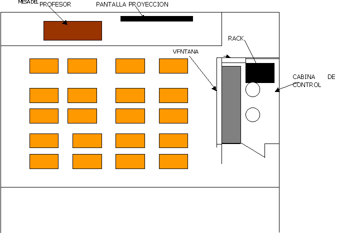 · ESPACIOS: Respecto a las dimensiones de este tipo de aulas, como dato orientativo, se puede hablar de una superficie entre 25-60 m2. Sí es importante tener en consideración la altura de este tipo de aulas: debe ser suficiente para facilitar la ubicación y visión correcta de una pantalla de proyección desde cualquier punto de la sala, así como para poder colgar en la misma focos u otros accesorios. Sin embargo un techo demasiado elevado, por otro lado, aumentaría el volumen total por lo que también lo haría el Tiempo de reverberación, empeorando la inteligibilidad en la sala (a menos que se tratara acústicamente de forma eficaz para minimizar este efecto) . Es aconsejable un valor de altura entre cuatro y seis metros, dependiendo también de la disposición geométrica de la misma. La disposición del aula debe diferenciar claramente cuatro zonas: mesa del profesor o conferenciante (en un plano más elevado que el resto), pantalla de proyección-pizarra, zona de alumnos y cabina de control (ver figura nº3) . Es muy importante disponer de un espacio técnico apropiado, independizado del resto donde se disponga todo el equipamiento necesario y se facilite la labor de los técnicos. Este espacio (cabina de control) deberá estar aislado acústicamente del resto de la sala y permitir el correcto visionado de toda la sala desde su interior mediante la correspondiente ventana de visionado (debe ser abatible para permitir la escucha directa del sonido en la sala) .