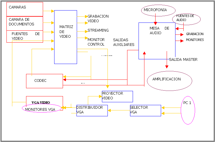 La señal del ordenador podrá ser proyectada, a la vez que convertida a vídeo para poder ser enviada al equipo de videoconferencia (convertidor VGA-PAL). Un factor a tener en cuenta es la posible ampliación a corto o medio plazo de la instalación, con la incorporación de nuevos equipos o facilidades por lo que a menudo resulta muy conveniente sobredimensionar la instalación, en especial la matriz de vídeo, con el fin de dar cabida a la incorporación de estos nuevos equipos o aumentar la flexibilidad de la instalación distribuyendo tomas auxiliares tanto de audio como de vídeo en la sala (en el estrado y en la cabina de control). De esta forma resulta mucho más económico abordar este sobredimensionamiento en el momento de la instalación que a posteriori, cuando resulta más costoso el tendido de nuevas líneas de cableado. En la figura 6 se puede ver un diagrama típico de conexión.