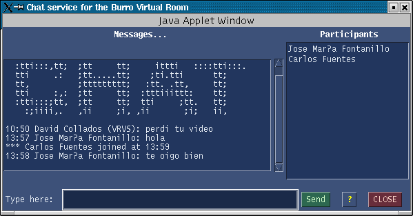 Cuando entramos en cualquier Sala Virtual, una ventana azul de chat se abre. El chat esta dividido en tres zonas. La parte de la derecha muestra los últimos mensajes que fueron enviados y los nuevos que alguien escriba. La zona de la derecha muestra un listado de la gente conectada al chat. La parte inferior sirve para que nosotros escribamos lo que queramos enviar al chat, donde dice "Type here:" ("Escribir aqui:").