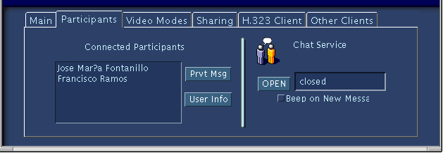 El subpanel "Participants" nos muestra toda la gente conectada al servidor de la sala y aunque tengan el chat cerrado, si seleccionamos a una persona de la lista y pinchamos en el botón de "Prvt Msg" podremos enviarle un mensaje de chat privado. La zona de la derecha muestra el estado de nuestro chat (abierto "opened" o cerrado "closed") y con el botón "OPEN" o "CLOSE" podremos volverlo a abrir o cerrar respectivamente. El cuadradito de "Beep on New Message" nos permite habilitar/deshabitar los bips que se oyen cuando alguien entra/sale del chat o envía algún mensaje.