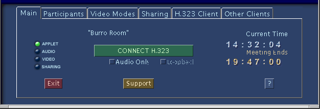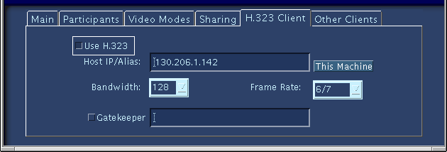 Conectar un cliente H.323 es bastante similar a conectar un cliente MBone. El primer paso a dar es ir al subpanel "H.323 Client" y seleccionar el cuadrito que dice "Use H.323" (Utilizar H.323). Después, en el campo "Host IP/Alias" escribimos la dirección IP o el hostname de nuestro cliente H.323 (si es un cliente como el NetMeeting, que corre en nuestro propio PC, la dirección IP que tendremos que escribir será la propia IP de nuestro PC, que además podrá el sistema escribir automáticamente por nosotros si pinchamos en el botón "This Machine" (Esta Máquina). A continuación tenemos que escoger el ancho de banda al que queremos conectar nuestro cliente H.323 a través del menú de "Bandwidth" (Ancho de banda). Las opciones son: 128, 256, 384, 512 ó 768 kbps. En "Frame Rate" seleccionamos el máximo número de imágenes por segundo que queremos que nuestro cliente envíe. Las opciones son: 6/7, 8/10, 12/15 ó 25/30. (NOTA: Si quisiéramos conectar un cliente H.323 a través de un Gatekeeper, seleccionaríamos el cuadrito de "Gatekeeper", escribiríamos en él el Hostname o la IP de nuestro Gatekeeper y en la zona de "Host IP/Alias" escribiríamos el "Alias" de nuestro cliente dentro de nuestro Gatekeeper.)
