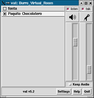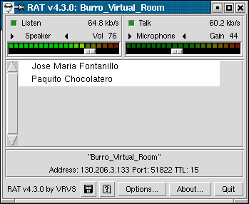 Al instalar el paquete principal de software del VRVS nos hemos bajado la versión 2.9.1 del VIC que es una versión proveniente de la UCL (University College London) con unos pequeños arreglos hechos por la gente del VRVS. También viene incluida la versión 4.3.2 de RAT para el sonido (este cliente proviene de la versión 4 de RAT de la UCL)