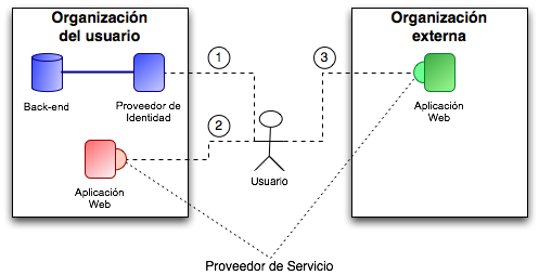 Para acceder a un recurso protegido en una federación, en un primer momento (paso 1 en la figura anterior) realizará el proceso de autenticación en el proveedor de identidad de su organización. Gracias a esta acción, obtendrá sus credenciales, las cuales generalmente están encriptadas de manera que sólo el proveedor de identidad y los proveedores de servicio puedan leerlas. En el momento que quiera acceder a una aplicación web de su organización (paso 2 en la figura anterio), no tendrá que volver a identificarse, sino que en la misma petición envía también sus credenciales. Nos encontramos con el mismo caso cuando acceda a la aplicación web (paso 3 en la figura anterior) de la organización externa que ha instalado un proveedor de servicio para proteger su recurso.