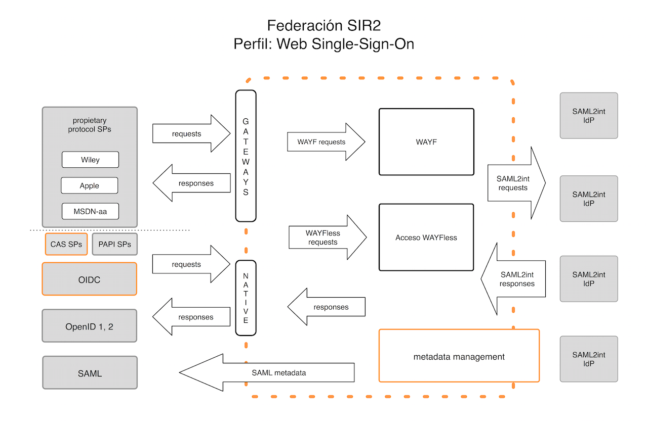 - El gestor de metadatos, que permite al operador de la federación modelar las relaciones de confianza entre proveedores de servicio y proveedores de identidad.