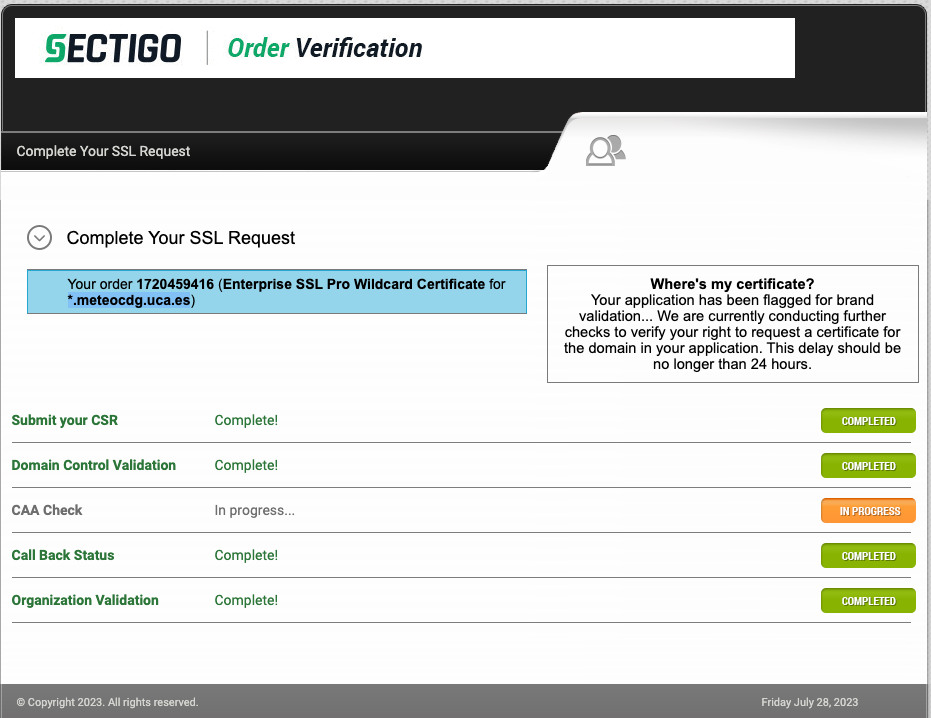 Por ejemplo para la solicitud con order number = 1720459416 y domain = *.meteocdg.uca.es se puede comprobar que Sectigo todavía está comprobando el estado del registro CAA: