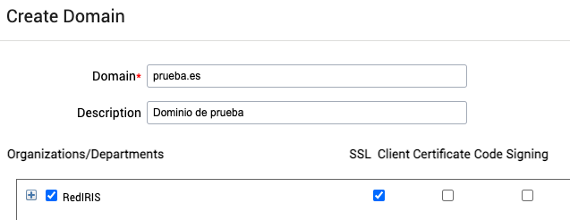 - Se debe crear un dominio en SCM con el nombre de la dirección IP pública que se desee incorporar al certificado.