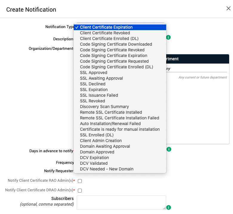 Sectigo no suele enviar correos automáticos avisando de los diferentos eventos que pueden ocurrir en el portal. Pero dispone de una opción de notificaciones que un RAO/DRAO puede configurar para recibir los avisos que deseemos, accediendo a Settings -> Notifications- -> Add.