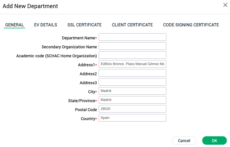 Sectigo requiere que la pestaña Settings -> Organizations -> (selección de la organización) -> Edit -> EV Details esté correctamente rellena para todas las organzaciones que vayan a solicitar certificados EV.