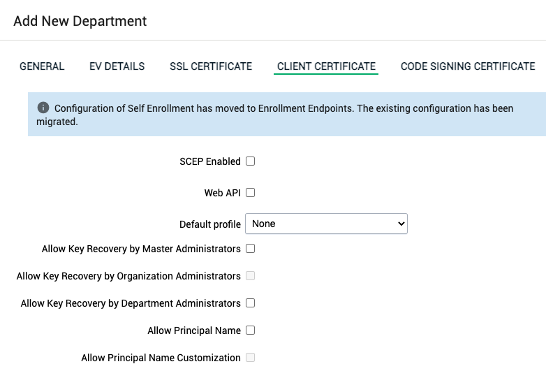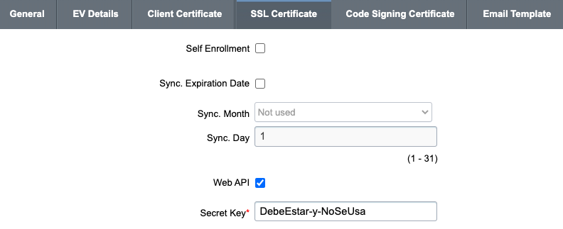 - Para poder utilizar las llamadas a la API para el manejo de certificados, debe editar la ficha de la organización o departamento en cuestión, y en la pestaña