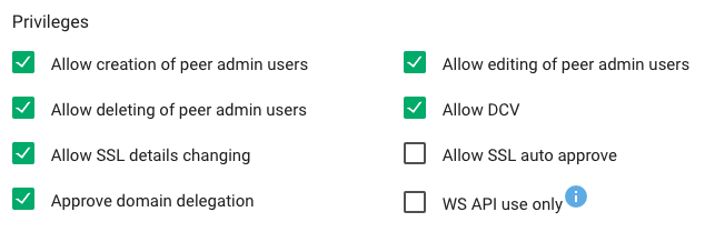 - Si se desea que el nuevo RAO creado por el RAO que creó RedIRIS, tenga otros permisos distintos a Allow SSL details changing y Allow SSL auto approve deberá solicitarlo a tcs(@)rediris.es.